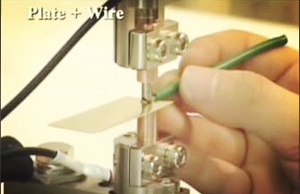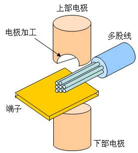 多股線的焊接 制造電(diàn)子機器時會經常用到多股線與端子的焊接。爲瞭(le)不使芯線飛散而将電(diàn)極加工成半圓形的溝槽狀。多股芯線焊接的同時與端子焊接在一起